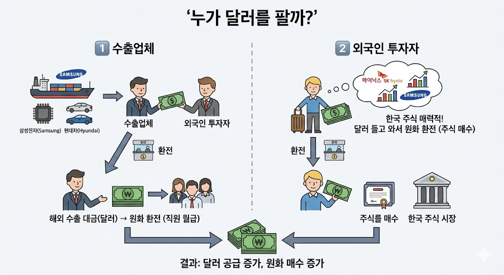 하고 달러를 들고 와서 원화로 바꿀 때가 또 그렇습니다.