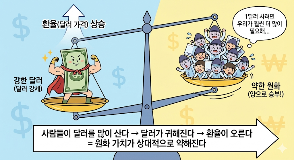 달러가 귀해져서 1달러의 가격(환율)이 올라요.